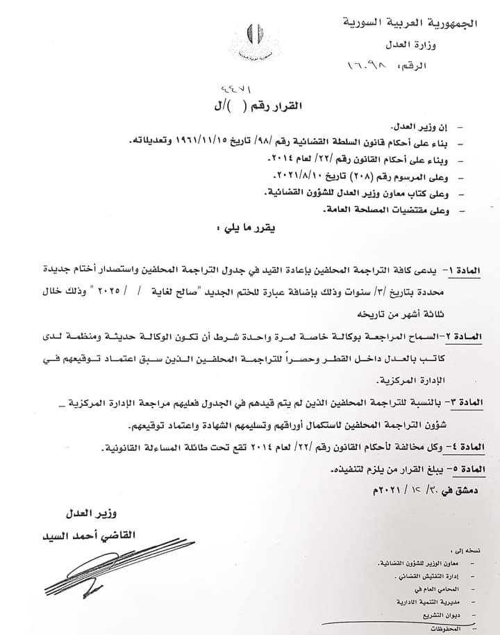 أصدر العدل القاضي أحمد السيد قرارا يدعو كافة التراجمة المحلفين بإعادة القيد في جداول التراجمة المحلفين واستصدار أختام جديدة محددة بتاريخ /٣/ سنوات وذلك خلال ثلاثة أشهر من تاريخه، وتضمن القرار السماح بالمراجعة بوكالة خاصة لمرة واحدة شرط أن تكون حديثة ومنظمة لدى كاتب بالعدل داخل القطر وحصراً للتراجمة المحلفين الذين سبق اعتماد توقيعهم في الإدارة المركزية.