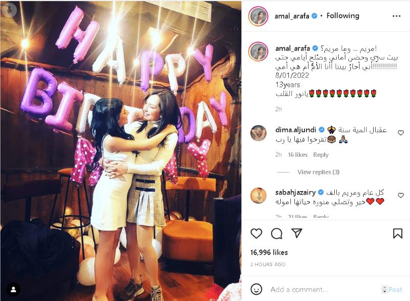 وكتبت عرفة: مريم.. وما مربم؟! بيت سري وحضن أماني وصلح أيامي حتى أني أحار بيننا أنا الأم أم هي أمي! ١٣ سنة يانور القلب، ونشرت تعليقاً آخر جاء فيه (( القمر صارت صبية الله يبعتلك الخير يا ماماتي))