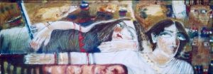 في لوحة العرافة كتل على نسق واحد استمد ألوانها من لون العجاج الذي يضيّق الصدر آن يحل دون إنذار.